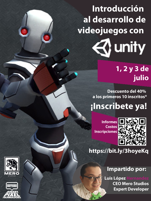 El participante aprenderá el funcionamiento escencial del software Unity para la creación de videojuegos 3d, videojuegos 2d, animación, programación de interactividad básica., ¿estás listo para aprender?, inscribete ya... Estamos seguros que te gustará...